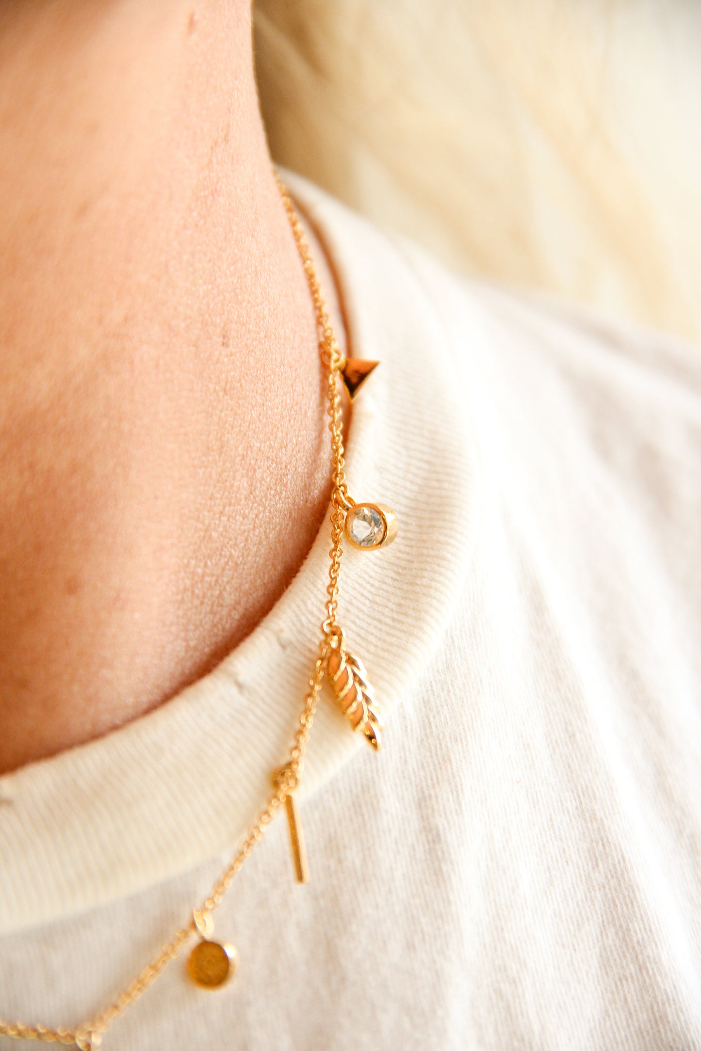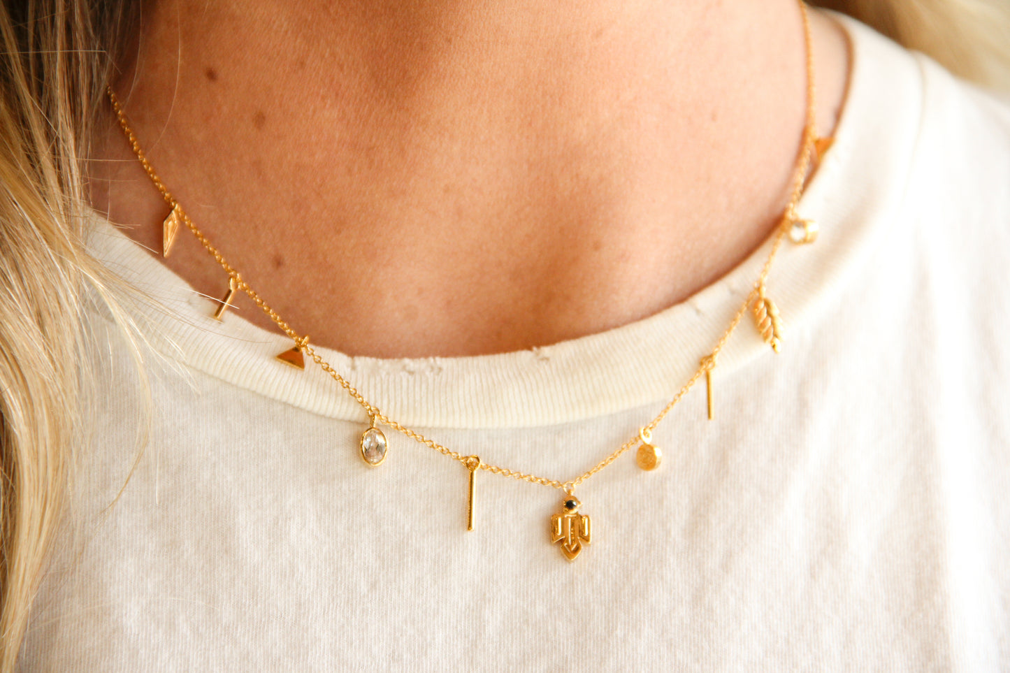 There are no rules! But for some general guidelines, begin with a shorter necklace that rests just above your collarbone as your base. Next, add a slightly longer pendant or charm necklace to create some depth. Finally, finish with a chain or main statement piece. Have fun with it!